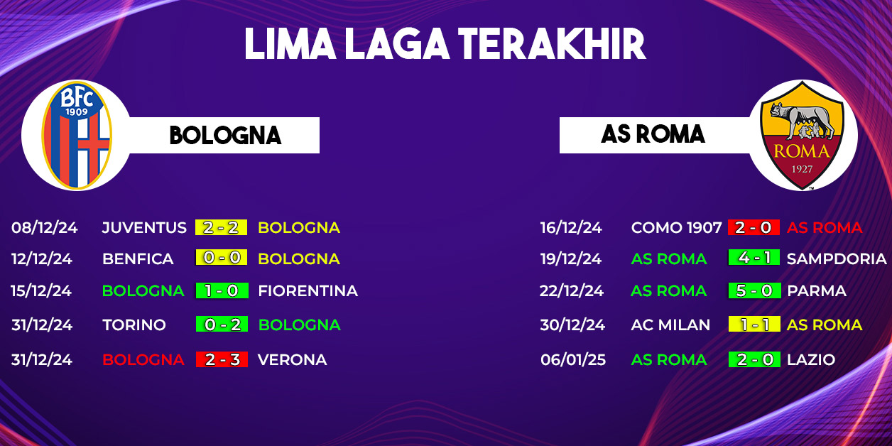 Bologna akan menjamu AS Roma di Stadio Renato Dall'Ara pada pertandingan pekan ke-20 Serie A 2024/2025. Laga Bologna vs AS Roma dijadwalkan berlangsung pada Senin, 13 Januari 2025, pukul 00.00 WIB, dan dapat disaksikan melalui layanan live streaming di Vidio. Pertarungan ini diprediksi menjadi laga menarik antara dua tim yang memiliki ambisi besar di musim ini.