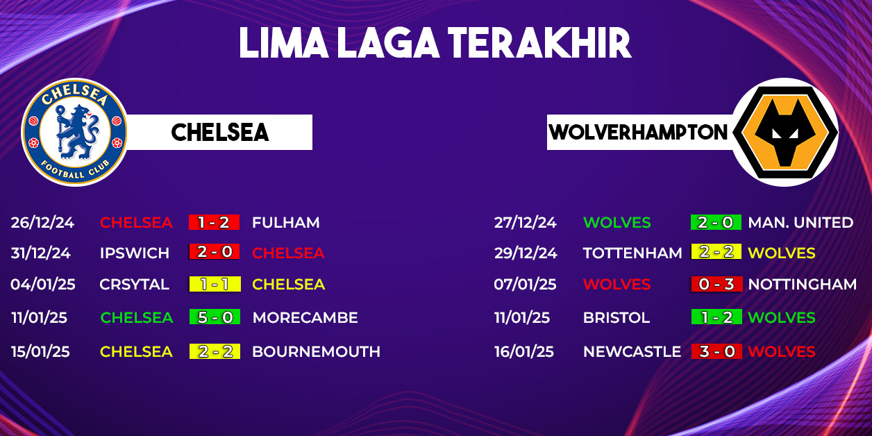 Dalam pertemuan terakhirnya melawan Wolverhampton, Chelsea tampil dominan dengan kemenangan besar 6-2. Hasil tersebut menunjukkan bahwa The Blues memiliki potensi besar untuk kembali mengamankan tiga poin di laga ini. Namun, mereka tetap perlu waspada karena performa yang tidak konsisten bisa menjadi penghalang.