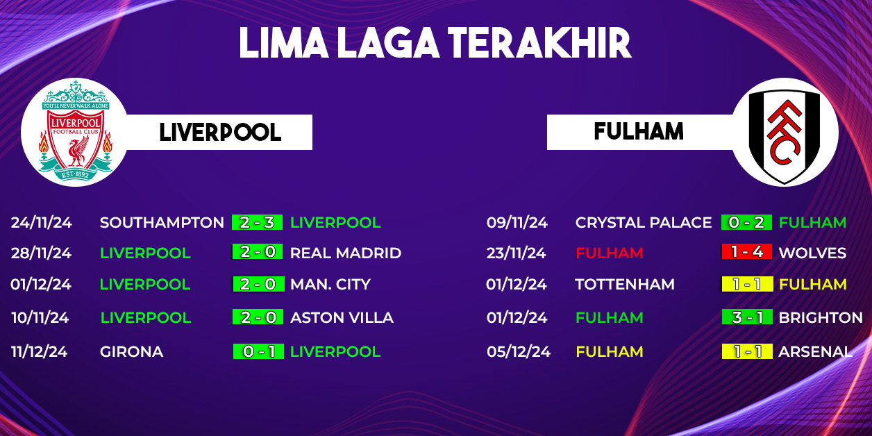 Dalam lima pertemuan terakhir di Premier League, Liverpool unggul dengan tiga kemenangan, sementara Fulham berhasil menang sekali, dan satu laga berakhir imbang. Fakta ini semakin memperkuat prediksi bahwa Liverpool memiliki peluang lebih besar untuk memenangkan pertandingan.